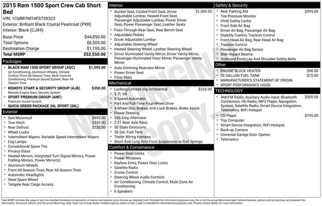 2015 Ram 1500 Sport Brilliant Black Crystal Pearlcoat 4WD HEMI 5.7L V8 Multi Displacement VVT 8-Speed Automatic